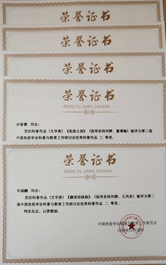 会议设报告、研讨、互动、颁奖等环节,会场气氛热烈。医学免疫学课程团队撰写的“一流课程背景下医学免疫学BOPPPS+混合式课程建设”论文被会议论文集收录。课程团队指导蒲公英免疫双科小组创作的科普作品被提交参加优秀科普作品评比,最终有六个作品被会议论文集收录;其中,临床医学专业员工孙智霖的科普小说“免疫之剑”、毛瑞麟的科普小品“趣谈结核病”获科普作品二等奖,另有三个科普作品获三等奖。
