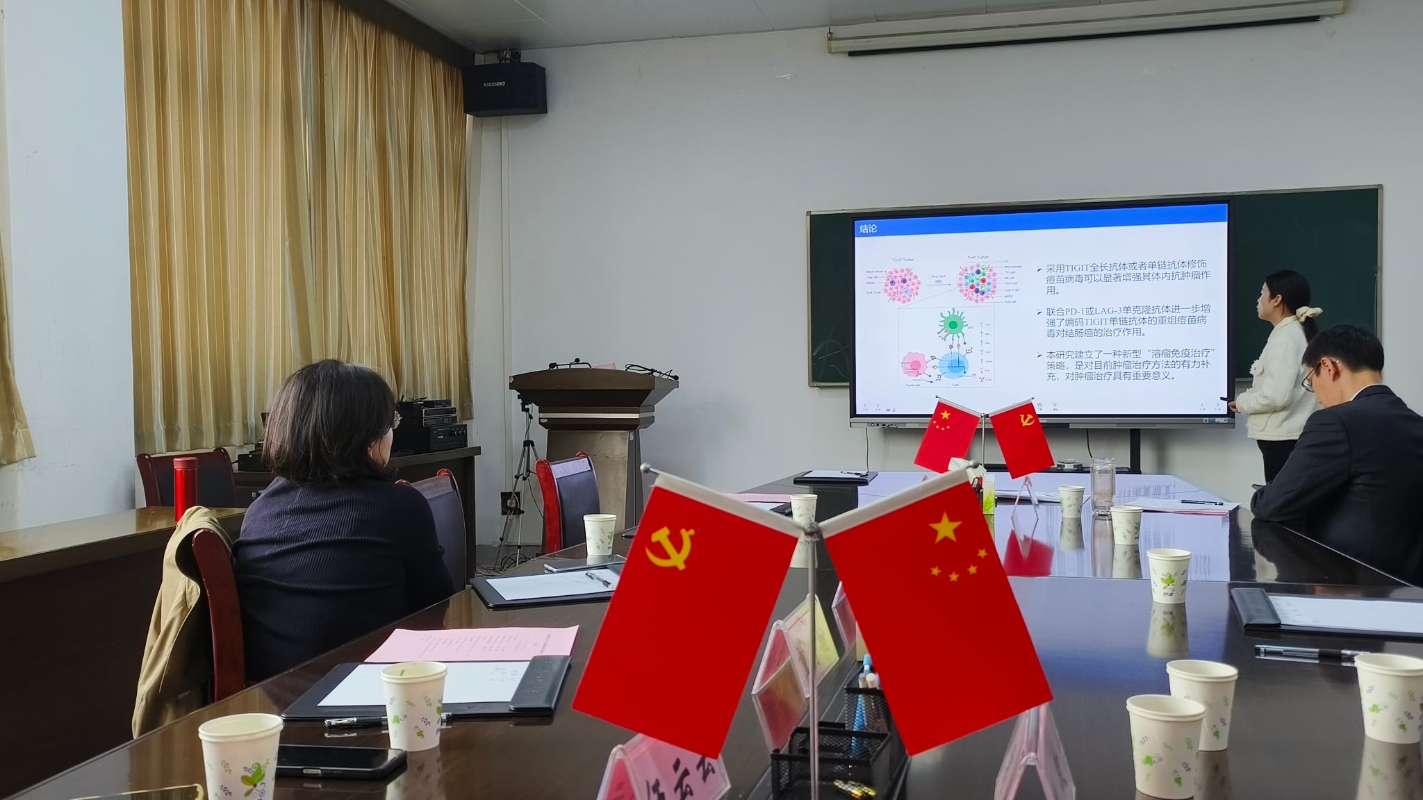 交流期间,学院经理李曙介绍了tyc8722太阳集团和医学免疫学学科基本情况。江维教授就其科研团队在《Science》《Cell》《Nature Immunology》上所发表的无菌性炎症发生的免疫学机制、肿瘤免疫治疗的开创性靶点等工作开展情况进行了分享。tyc8722太阳集团医学免疫学学科青年博士代表介绍了自己当前的科研工作进展情况,并就国家级项目申报的思路和方法与江维教授进行交流,以进一步明确下一步工作方向。