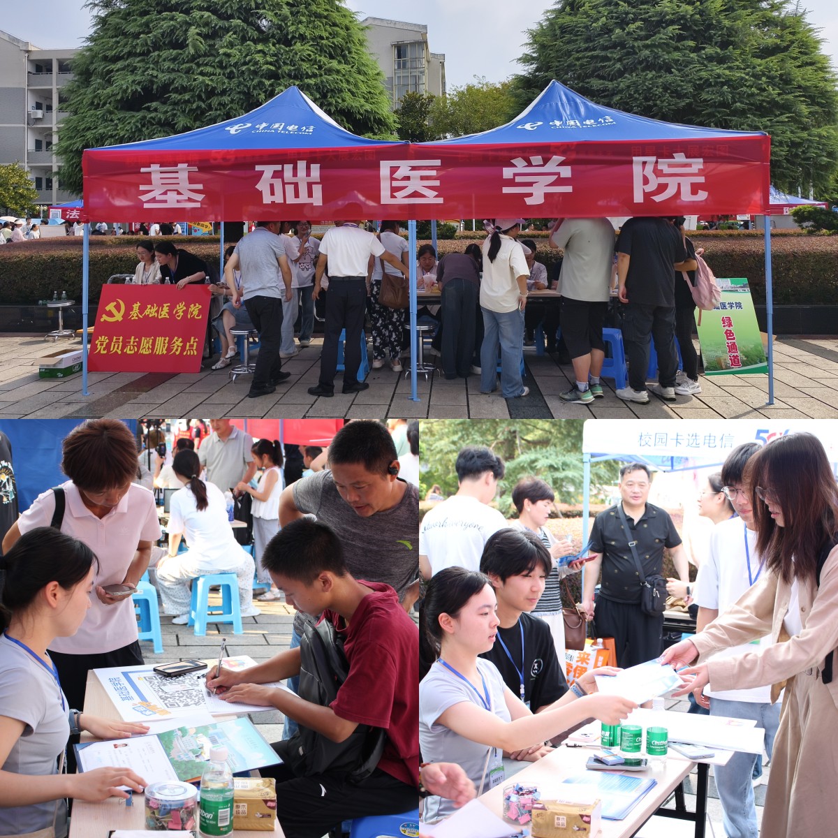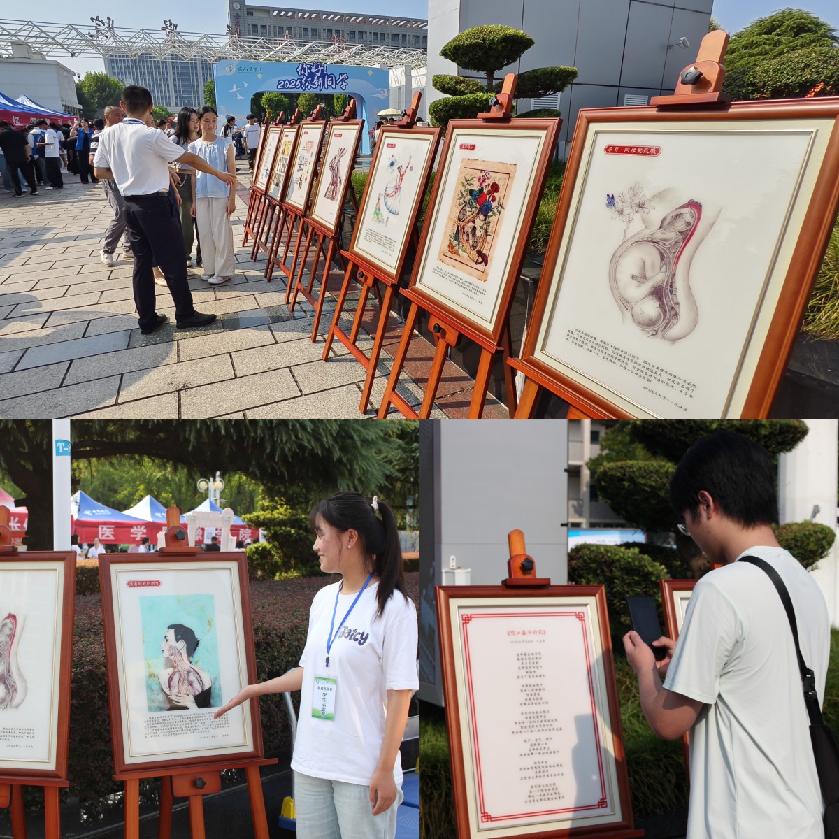 报到现场流程清晰、分工明确,志愿者员工穿梭在人群中,主动热情地为新生搬运行李、指引路线、答疑解惑,他们的精准引导和灿烂笑容成为迎新现场一道亮丽的风景线。学院的教师们耐心解答家长疑问,开展反诈宣传,提醒新生和家长们警惕诈骗陷阱,言语间充满关切,令人倍感安心。整个报到环节忙而不乱,各项工作有条不紊。学院特别设置了“基础医学优秀人文作品展”,展出员工创作的“人体解剖图谱”和“我与实验动物的故事”等,吸引了众多新生及家长驻足欣赏。这一特色展示不仅彰显了学院“科学精神与人文素养并重”的育人理念,更让新生初入校园便感受到医学的温度与厚度。