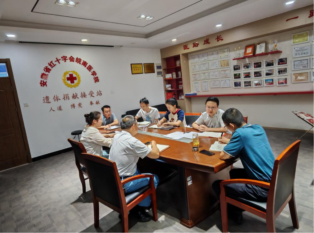 会上,人体解剖学实验实训中心副主任李强从保障教学、接受站运行、遗体捐献等方面简要介绍了中心教学工作及皖医接受站相关工作情况。人体解剖学教研室主任龚鑫对保障教学工作进行了补充说明,中心各工作人员就本职工作进行了汇报。