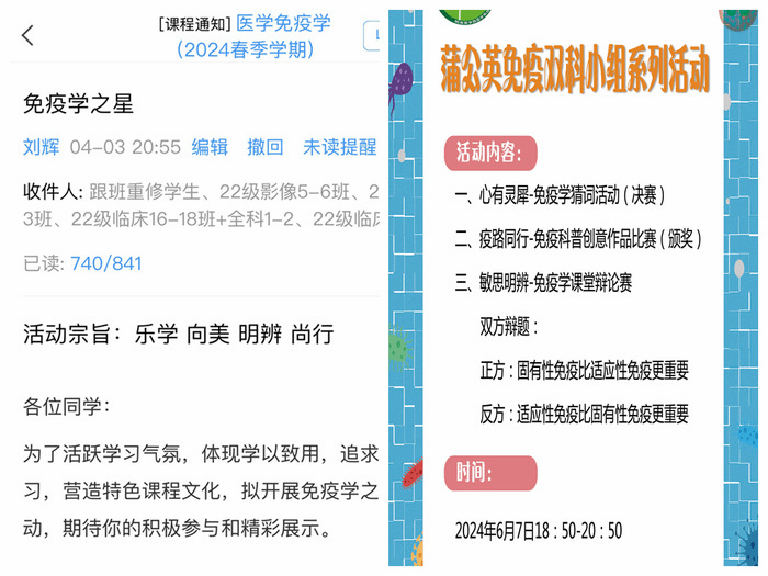 “免疫学之星”活动旨在鼓励员工“乐中学、做中学、辩中学”,从而激发学习热情,培养表达、批判、思辨能力和合作、创新、责任意识,以凸显一流课程的“两性一度”。今后,医学免疫学课程团队将持续开展丰富多样的第二课堂活动,努力营造“乐学、向美、明辨、尚行”的课程文化氛围。