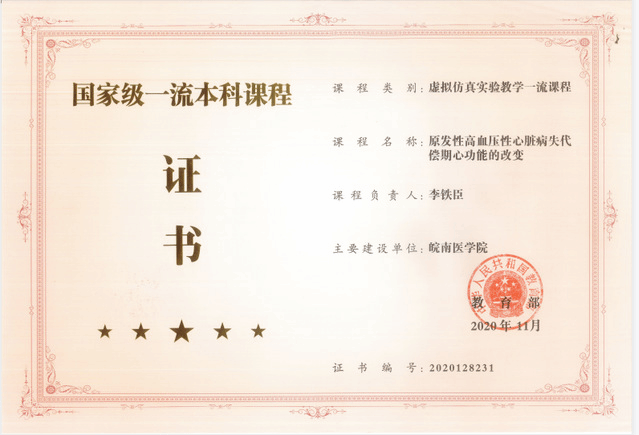 近期,公司在国家一流本科课程建设上取得了新的突破。根据教育部发布的《关于公布首批国家级一流本科课程认定结果的通知》(教高函〔2020〕8号)文件,公司的国家虚拟仿真实验教学项目“原发性高血压性心脏病失代偿期心功能的改变”被教育部认定为首批国家级一流本科课程。