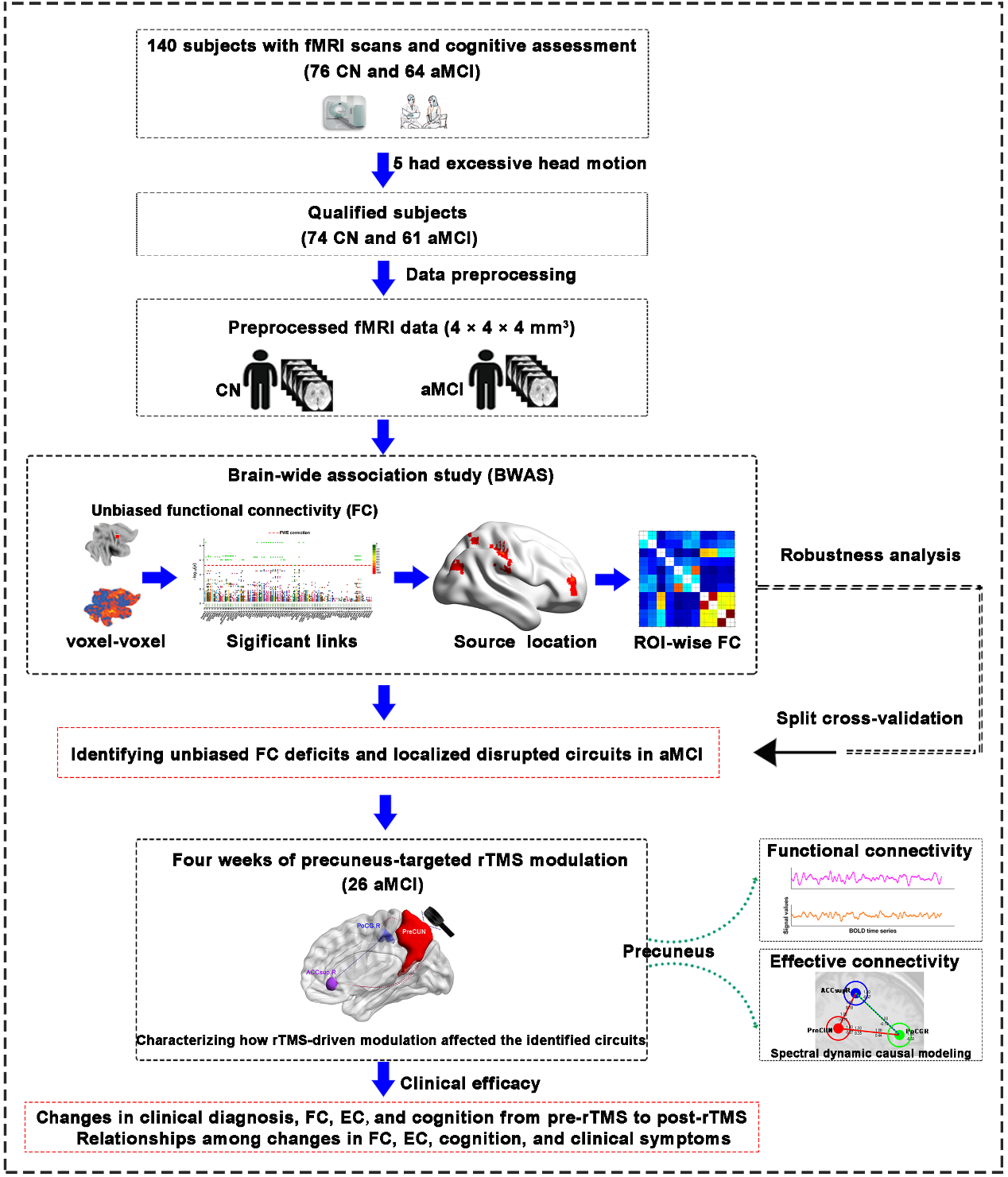 阿尔茨海默病(AD)是全球发病率最高的神经退行性疾病,目前尚无根治手段,其病程不可逆且呈进行性恶化,给患者家庭与社会带来沉重负担。临床研究证实,遗忘型轻度认知障碍(aMCI)是 AD 的关键临床前期阶段——此时患者已出现记忆衰退,但尚未达到痴呆诊断标准,若能及时干预,可显著延缓甚至阻断 AD 病程进展。然而,传统 AD 前期干预面临两大核心瓶颈:一是损伤模式不明确——现有研究多基于“预设脑区” 分析,难以客观捕捉脑功能网络的整体损伤特征,导致干预靶点缺乏精准性;二是调控逻辑不清晰——多为“对症治疗”,未从脑网络“因果调控”角度破解认知衰退的核心机制,干预效果有限。因此,寻找 AD 临床前期的核心致病枢纽与精准调控策略,成为全球神经科学领域的研究热点与难点。