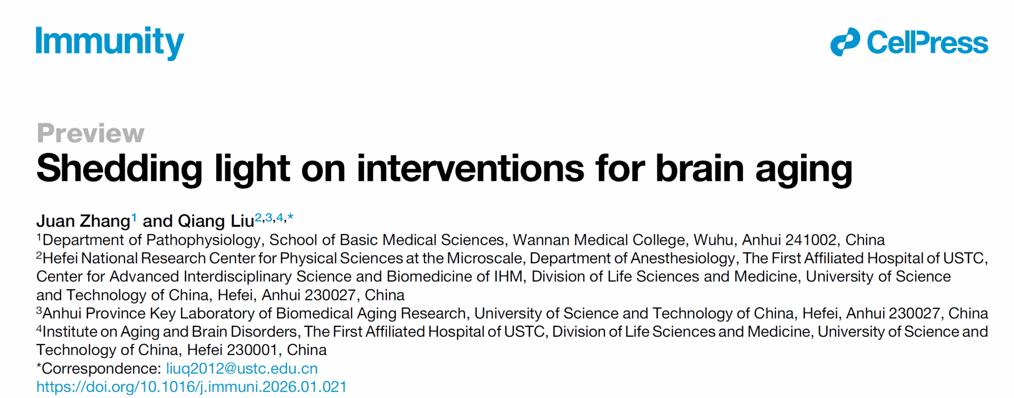 近日,学院张娟副研究员团队在国际顶级期刊《Immunity》上发表了题为《Shedding light on interventions for brain aging》的评述论文。该评述系统回顾了脑衰老干预和治疗的困境,着重阐述了免疫治疗在脑衰老领域的应用前景和潜在方案,同时描述了近期免疫治疗在脑衰老领域的研究进展,为理解脑衰老及相关神经退行性疾病的干预提供了新视角。