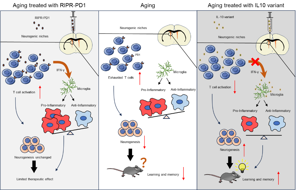 脑衰老的主要特征是认知功能下降,记忆丧失,同时伴随脑结构,神经网络以及分子通路的退行性改变,脑衰老也是神经退行性疾病的重要风险因素,然而如何干预脑衰老仍然是领域内的难题。该文主要从免疫治疗的角度,回顾了该领域的主要进展,尤其是聚焦T细胞和小胶质细胞,设计免疫检查点抑制剂和细胞因子等靶向治疗手段。直接注射免疫检查点抑制剂RIPR-PD1进入大脑,会引起T细胞数量在衰老大脑内的上升,同时还会活化小胶质细胞,释放炎症因子。同时发现RIPR-PD1会促进多种类型的细胞发生衰老,但会抑制神经根干细胞的衰老,但并不足以恢复衰老小鼠的成体神经发生过程。衰老过程中的促炎和抑炎细胞因子的平衡会打破,但给予IL10的变体(D25K的突变)会恢复这个平衡,减少T细胞的活化,减缓大脑中多种细胞的衰老进程,促进神经再生,从而增强衰老小鼠的学习记忆能力。以细胞因子为基础的免疫疗法,同时结合T细胞抑制的综合疗法,或许是脑衰老免疫治疗的未来方向。