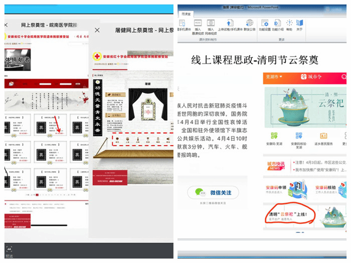 与往年组织现场的缅怀场面不同,此次清明节云祭奠遗体捐献者活动是通过扫描二维码或关注皖医遗体捐献接受站公众号全程在线上进行。在活动开展的前期,组织召开线上会议,全体教师积极讨论并制定了云祭奠具体方案和相关活动流程。活动当天,各位授课教师有序指导班级员工进入“皖医接受站”页面进行献花、鞠躬、点烛、追思留言等云祭奠,同时进行了对抗击新冠肺炎斗争牺牲烈士和逝世同胞哀悼活动。