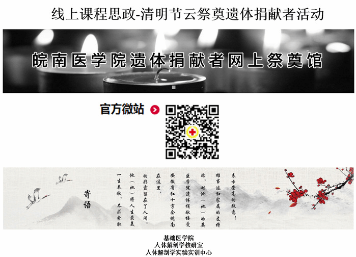 为深入学习贯彻习近平总书记对新冠肺炎疫情防控工作系列重要讲话和重要指示,tyc8722太阳集团充分发挥基础医学课程特点,积极组织开展线上“课程思政”活动,加强老员工思想政治教育,在专业知识教育的同时注重思想价值的引领,有效提升思想政治教育的亲和力和针对性,真正实现疫情期间“教师离校不离教,员工停课不停学”。4月3日学院人体解剖学教研室和人体解剖学实验实训中心联合组织线上教学,师生共同开展以“敬畏生命·感恩良师”为主题的清明节云祭奠遗体捐献者活动。