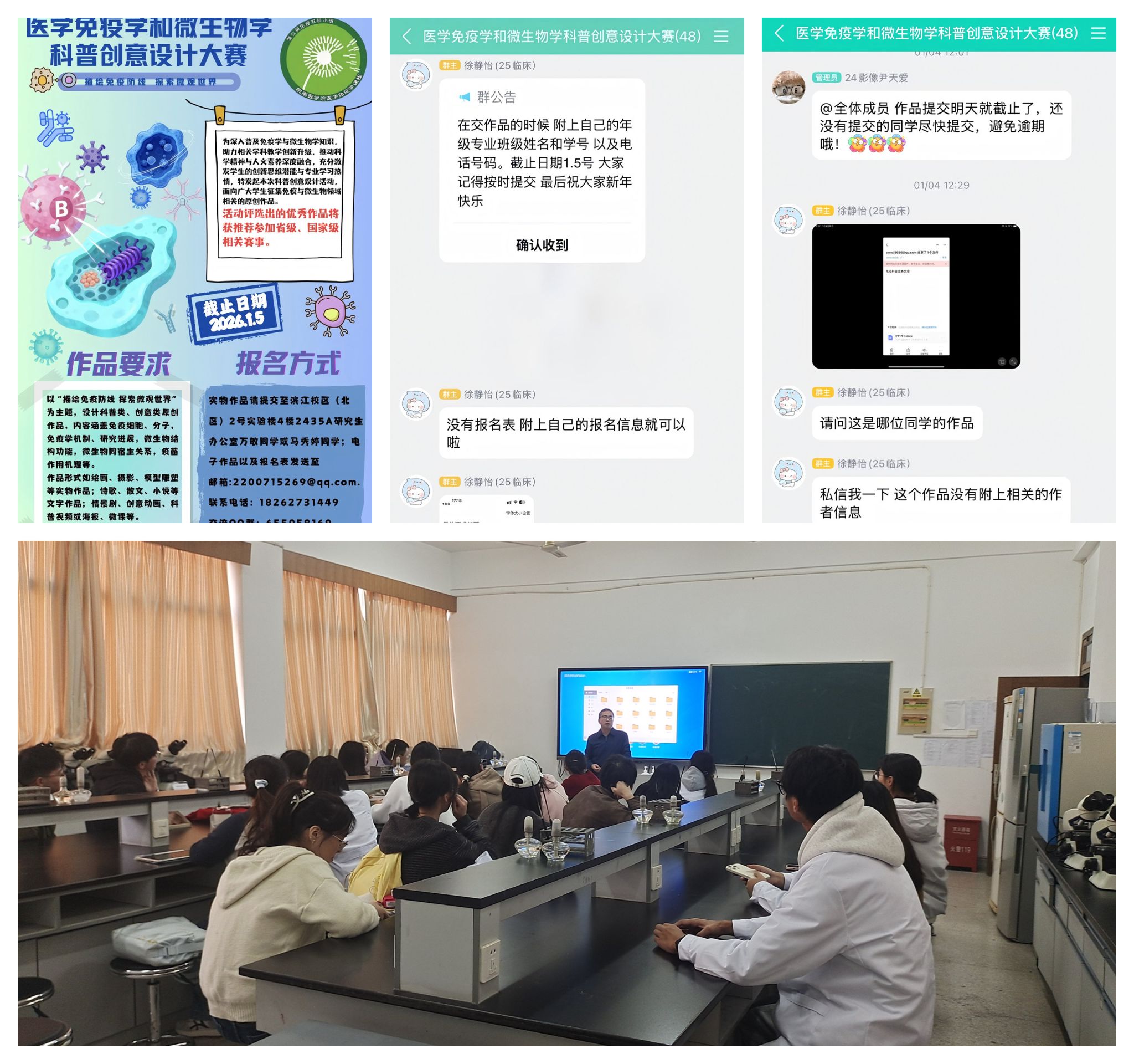 本次大赛依托《医学免疫学》国家一流本科课程、《医学微生物学》线上线下混合课程为基础,以“延展课堂教学,促进知识传播”为主要目标,通过发布比赛海报广泛宣传,吸引同学参赛。同时,建立大赛QQ群,帮助参赛选手明确比赛要求与创作方向。蒲公英免疫双科小组的指导老师在赛前召开比赛说明会,引导选手围绕医学免疫学与微生物学核心知识点进行创意设计。大赛得到了全校同学的广泛关注与积极响应,共收到短文、小说、诗歌、视频、海报、绘画等各类作品50余份。选手们充分发挥想象力与创造力,将抽象的专业知识转化为通俗易懂、妙趣横生的科普作品,实现了科学知识与艺术灵感的融合。