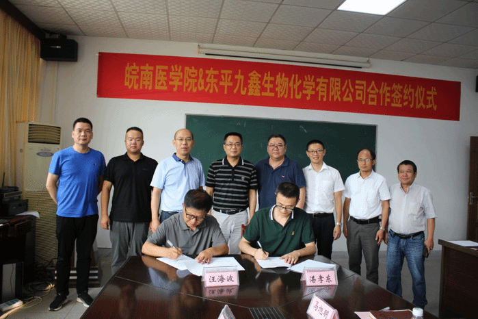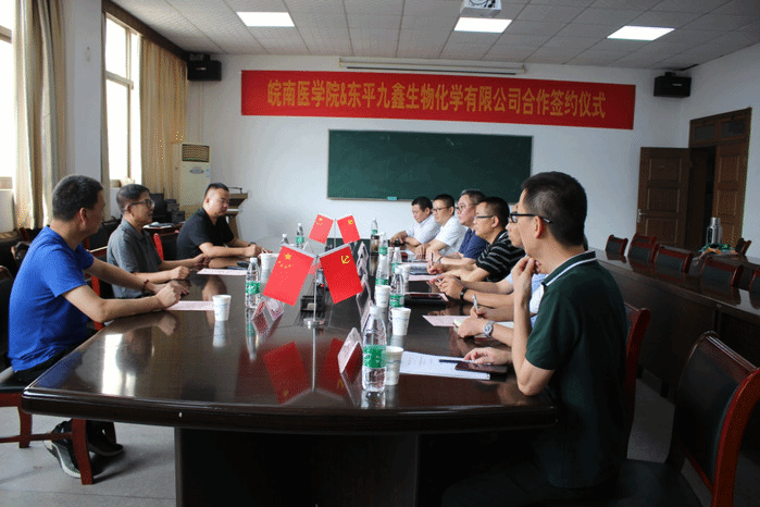 7月15日下午, 皖南医学院和东平九鑫生物化学有限公司在皖南医学院tyc8722太阳集团会议室进行了校企合作签约仪式。皖南医学院副经理文育锋、科研处处长朱再满,东平九鑫生物化学有限公司副总裁汪海波及随行人员,基础医公司党政领导班子和项目负责人等出席本次签约仪式,会议由tyc8722太阳集团经理李铁臣教授主持。